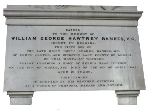 William George Hawtry Bankes VC has mainly three remembrance memorials in Dorset, a stained glass window at Studland Church, family vault at St Nicholas’ churchyard and a plaque in church St Cuthburga in Wimborne, near his Dorset home (below picture).